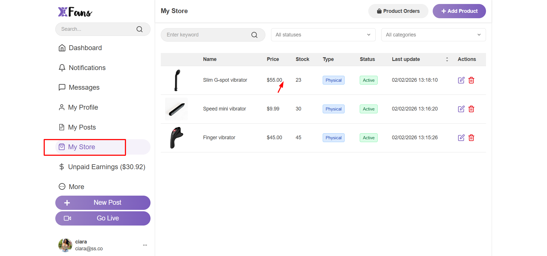 - On this page, you will find all your store products listed. Click on the Edit or Delete buttons for modify or remove that item, respectively.