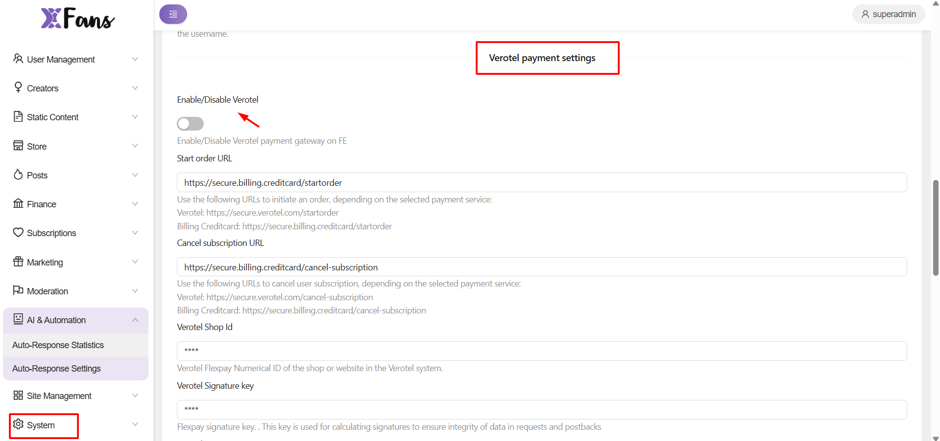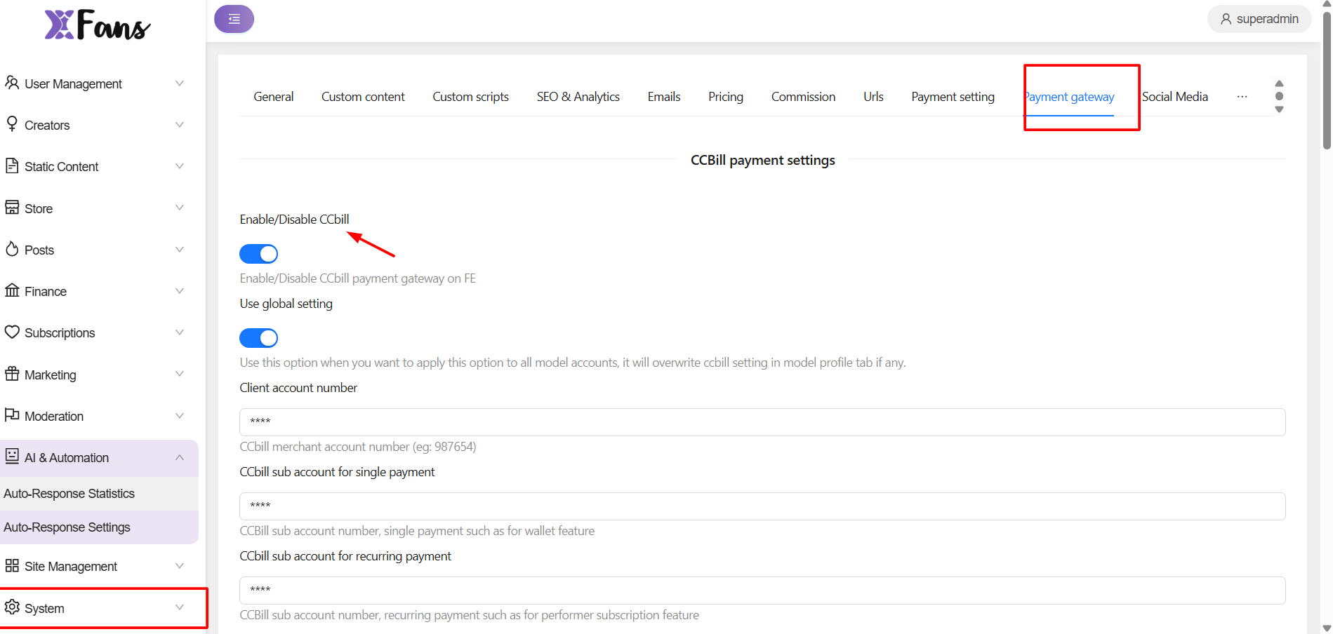 Go to Site settings > Payment Gateways to set up both CCBill and Verotel details.