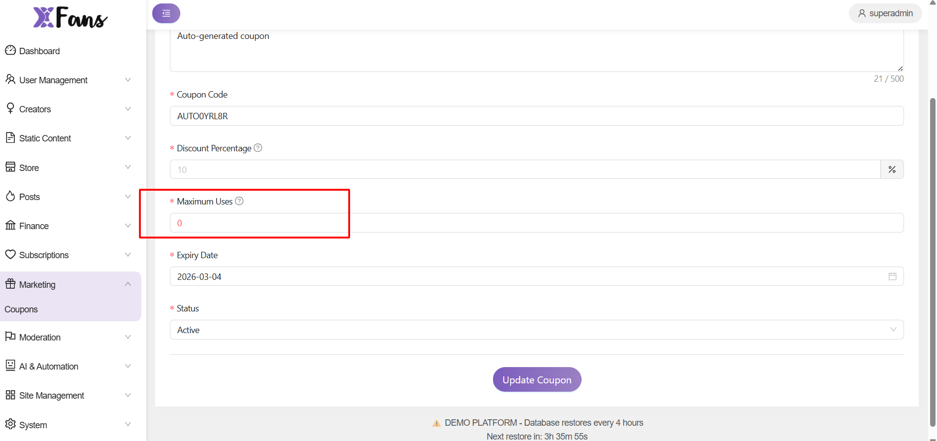 When creating a coupon, set the discount percentage and maximum number of people from the highlighted options.